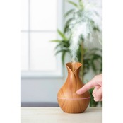 木目調で視覚的にもリラックス効果のある加湿器。・作動中にグラデーションライトが優しく光ります。・スイッチ1つで【ミスト+ライト】【ミストのみ】【電源OFF】の操作ができます。・加湿量/30~35mL/h・自動停止機能/約4時間・水タンク容量/130mL